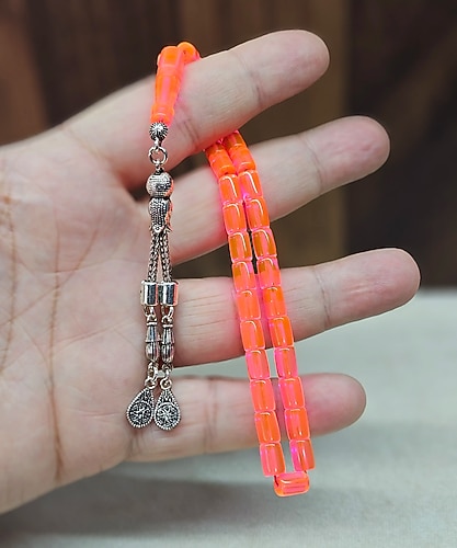 Görselde neon renkte, şık metal aksesuarlara sahip bir tesbih görülmektedir. Metal aksesuarlar, tesbihe zarif bir dokunuş katmaktadır.habbe ölçüsü:5.5x8 mm dir.tesbih boyu: 24 cm dir.