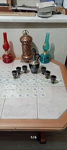 Tam set. 1960 lı yılların Rus üretim karaf seti. 7 parça. mineli El boyama topraktan mamül karaf 22 cm, kadeh 6 cm. kadehin birinin altında küçük belirsiz bi atık var resimde mevcut aklınıza takılan soruları sorup bilgi alabilirsiniz iade yoktur dolabımı ziyaret ederek farklı ürünler görebilirsiniz 😇 alana hayırlı olsun