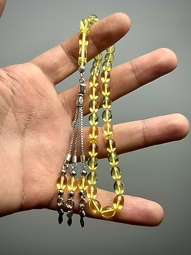6,5x8,5mm habbe ölçülerinde 3 yedek habbeli 925 ayar gümüş püsküllü Net: 8,5 gram, püskülü ile birlikte 13,65 gram ağırlığında Doğal Kaya Damla Kehribar Tesbih Ü.K: 9012