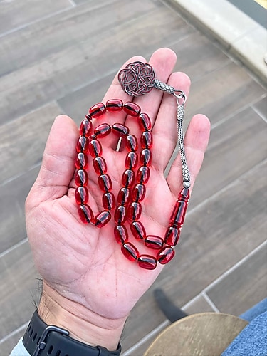1000 ayar kazaz gümüş püsküllü, kapsül kesim ateş kehribar tesbih.