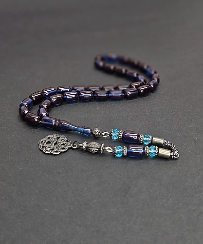 Kazaz püsküllü sıkma kehribar tesbihtir.habbe ölçüsü 7 x 11 mm dir.