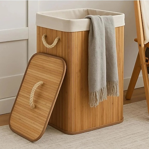 Bambu kirli çamaşır sepeti, doğal dokusuyla estetik bir görünüm kazandırırken, ev dekorasyonunuza şık bir dokunuş ekler