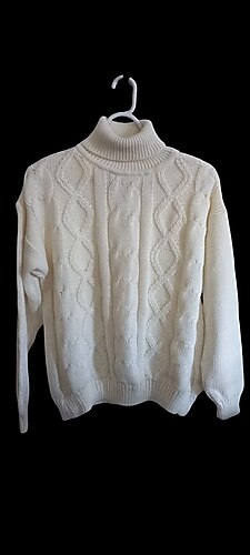 Kışlık Bayan Boğazlı Kazak: Sol boğazın hemen altında sarı lekesi vardır. Yıkanmıştır ama kosla ile belki çıkabilir. Söküğü yoktur. Çok güzel ısıtır, oldukça esnektir. Beden yazmıyor etiketi yoktur. L bedene olabilir. İade olmadığından verdiğim ölçülere göre alım yapınız. Boy 60 cm.-Koltuk altından itibaren boyu 39 cm.-Koltuk altından koltuk altına tek taraftan eni 62 cm. (Esneme 9 cm.)-Orta kısımdan tek taraftan eni 55 cm.-En altından tek taraftan eni (Lastiklidir) 39 cm.(Esneme 13 cm.)-Omuz 18 cm.-Kol boyu 49 cm.-Kol ortasından tek taraftan eni 17 cm.(Esneme 7 cm.)-Bilek girişinin tek taraftan eni 8 cm.(Esneme 6 cm.)-Kol oyuntulu değil düz iniyor 22 cm.-Boğaz kısmı enxboy 15x17 cm.'dir.