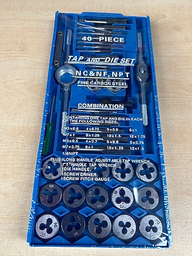 40 parca klavuz pafta takımı Ürün iceriăi 1 ad : klavuz kolu 1 ad:pafta kolu 1 ad:mini tornavida 1 ad mini cak 17 ad:farkli ölcülerde klavuz 17 ad :farkli ölcülerde pafta 1 ad:T anahtar 1 ad:plastik kasa Klavuzlar M3X0.5, M3X06. M4X07. M4X0.75. M5X0.8. M50.9, M6X0.75 M6X1.0. M7X0.75. M7X1.0. M8X1.0. M8X1.25, M10X1.25 M10X1.5. M12X1.5. M12X1.75. 1/8 NPT27 Paftalar M8X1.28, M8X1.0, M10X1.5, M10X1.25,1/8NPT27 M5X0.9. M6X1.0. M6x0.75. M7X1.0. M7X0.75. M3X0.5 M3X0.6 M4X0.7. M4X0.75, M5X0.8. M12X1.75, M12X1.5