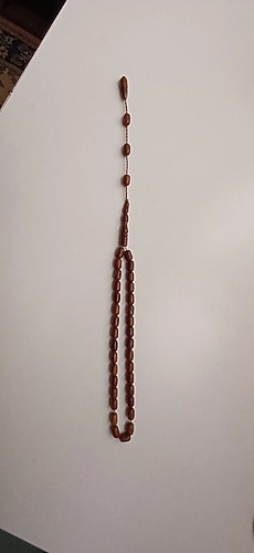 Minimalist tarzda, koyu kahverengi ve geleneksel görünümlü erkek tesbih. Düzgün, eşit boyutta boncuklardan oluşur.
