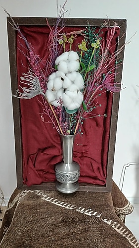 1980 lere ait vazo ve yeni açmış pamuk ve kuru çiçekler ile dekore edilmiş Tablo