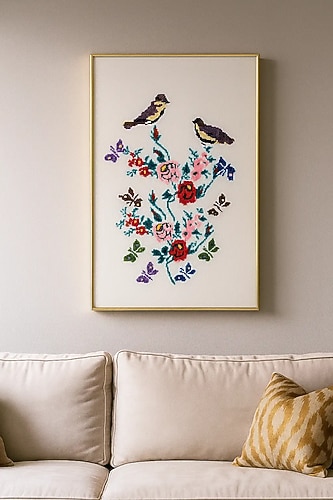 Çiçeklerin üzerindeki iki kuş ve kelebeklerden oluşan tablo baharı yansıtıyor. Arkasında ikili asma yeri bulunan ve 41 cm X 59 cm ölçülerinde olan beyaz etamin (aida) kumaş üzerine kanaviçe (cross-stitch) işi altın renk metal çerçeveli camlı tablo Sevnaz SOYKAN GÜRAKAR'ın eseridir. Sanatçı bu tablosuna "Baharın renkli melodisi" ismini vermiştir.