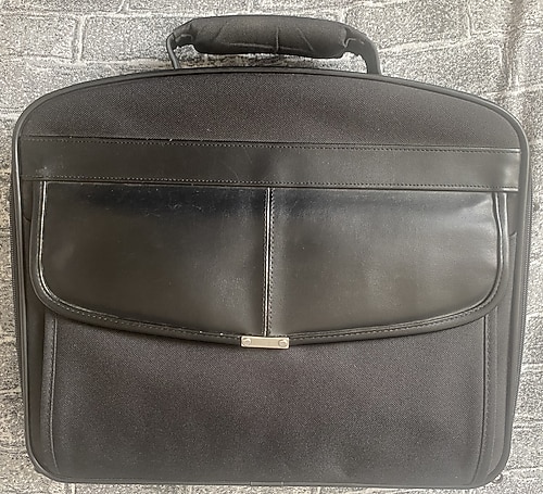 Suni deri ve tekstilden üretilmiş, 40 x 33 x 7,5 ölçülerinde az kullanılmış laptop çantası. Omuz askı kayışı da mevcuttur.