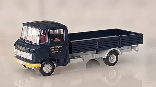 Ticari araç literatüründe "Düsseldorfer" (T2) olarak bilinen ve 1960'ların sonundan itibaren yolların hakimi olan Mercedes L408, Wiking'in karakteristik üretimiyle 1:87 ölçeğinde hayat buluyor. Model, dönemin lojistik ruhunu yansıtan "Zippert & Co" firmasına ait özel giydirmeye sahiptir. Aracın ağırbaşlı Lacivert gövdesi üzerine işlenen beyaz firma logoları, o yılların kurumsal kimlik anlayışını vitrinlere taşıyor. Wiking, aracın kendine has geniş ön panjurunu, büyük cam yüzeylerini ve kasa detaylarını kalıba başarıyla aktarmıştır. Bu emektar kamyonet, koleksiyonerler için saklanmış orijinal kutusunda ve sıfır kondisyondadır.