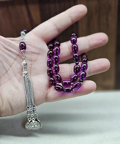 Mor Kehribar Tesbih Gümüş renkteki aksesuarlarıyla şık bir tasarıma sahiptir.habbe ölçüsü:9x11.5mm dir. tesbih uzunluğu:36cm dir.