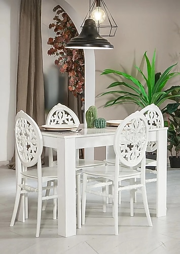 Beyaz renkte, oyma desenli sırt dayanaklı dört sandalye ve dikdörtgen yemek masası içeren şık bir yemek seti. ️