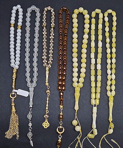 HERBİRİ MUHTEŞEM GÜZELLİKTE TOPTAN FİYATINA 7 ADET TESBİH KAÇMAZ FIRSAT (4 adeti püsküllü) (3 adeti püskülsüzdür) 1 adet sedat peker inci tesbih gold püsküllü - 1 adet lüx kedi gözü - 1 adet cam inci gold püsküllü - 1 adet sıkma kehribar ayyıldızlı gold püskül - 1 adet küre kesim beyrut damla - 1 adet kapsül kesim beyrut damla - 1 adet arpa kesim beyrut damla TOPLAMDA 7 ADET TESBİH...