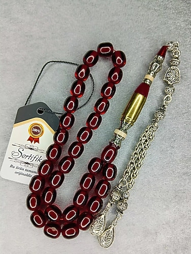 MERMİ MODEL NAKKAŞ İMAME ATEŞ KEHRİBAR TESBİH 8.5X10 MM HABBE ÖLÇÜSÜ BADEM KESİM KOLEKSİYONLUK RESİMDEKİ TESBİH KARTIN KUTULU GÖNDERİLECEKTİR.