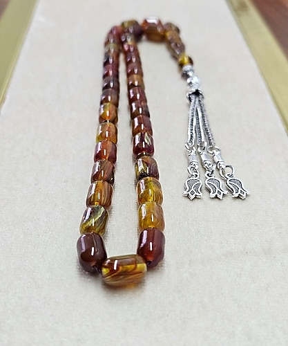 Şık tasarımlı Zara tesbih, kahverengi doğal taşlardan ve gümüş detaylardan oluşmaktadır. Günlük kullanım için idealdir.imame ölçüsü 9x11 mm dir.