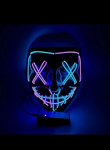 Mavi ve mor neon ışıklarla tasarlanmış yüz maskesi, küçük pil kutusuyla çalışır ve gece etkinlikleri için parlak bir görünüm sağlar. Ağırlığı 87gr olduğu için kullanımda yorucu ve rahatsız edici değildir. Boyutları ve videosu paylaşıldı. Güzel günlerde kullanmanızı dilerim.
