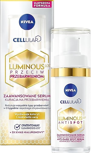 NIVEA Luminous630 Leke Karşıtı Aydınlatıcı Cilt Bakım Serumu, hafif formülü sayesinde tüm leke tiplerinin görünümünü azaltmaya yardımcı olur ve cildin doğal ışıltısını ortaya çıkarmak için yeni leke görünümüne karşı savaşmaya yardımcı olur. Formül 2 kat daha fazla Hyaluronik Asit ile zenginleştirilerek cildi dolgunlaştırır ve yoğun bir şekilde nemlendirir. Mevcut pigmenteasyon üzerinde etki göstererek, koyu lekeleri aydınlatmaya ve boyutunu küçültmeye yardımcı olur.