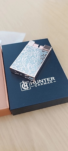 ürün, orjinal hunter pilli çakmak. pürmüzlü ve pembe alevli. desenli, goldrose ve gümüş renk. mükkemmel bir ürün. orjinal kutulu. normal çakmak gazı ile doluyor. ateşleme sistemi pilli. farklı tarz çakmak modelleri için diğer ilanlarıma bakabilirsiniz.
