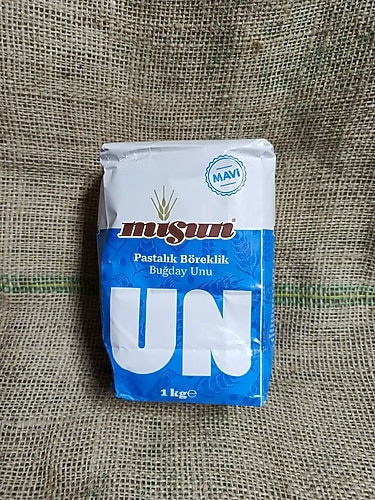 Pastalık Böreklik buğday unu, 1 kg paket içinde, açık mavi ve beyaz ambalajda. Hamur işleri ve börek için uygundur.
