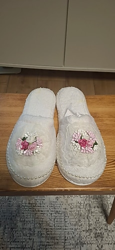 Peluş çiçek ve inci süslemeli gelin terliği.
