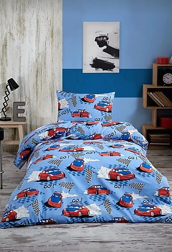 Renkli Baskılı Mavi tek kişilik Nevresim Seti çarşaflı