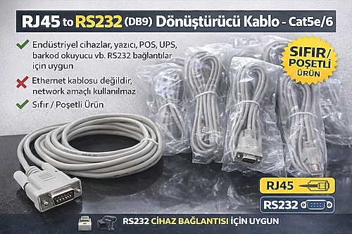 RJ45 uçtan RS232 DB9’a dönüştürücü kablo. Sanayi tipi cihazlar, yazıcı, POS, UPS ve barkod okuyucularda seri haberleşme için uygundur.