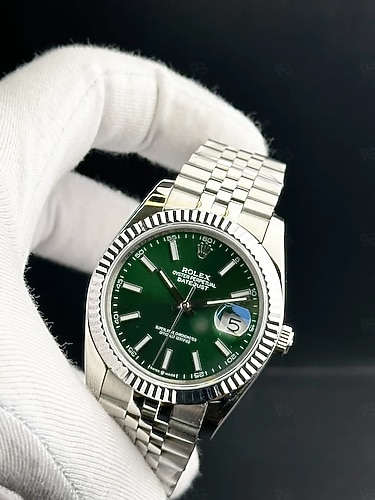 Rolex Datejust – Özellikler Kasa: Paslanmaz çelik (Oystersteel) Çap: Büyük olasılıkla 40 mm (Datejust 40) Çerçeve (Bezel): Fluted (tırtıklı) – beyaz altın kaplama Kadran: Yeşil kadran, baton indeksler Cam: Safir cam + Cyclops büyüteç (tarih için) Mekanizma: Rolex Calibre 3235 (otomatik) Hassasiyet: Superlative Chronometer (−2 / +2 sn/gün) Bilezik: Jubilee bilezik (5 sıralı) Su geçirmezlik: 100 metre (10 ATM) Tarih: Saat 3 konumunda