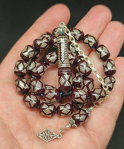Oğuzhan Karadağ usta tarafından 1000 ayar gümüş çakımları yapılmış harika bir ateş kehribar tesbihtir. ustanın işçiliği çok güzeldir. 10*8 mm ölçülerinde. püskülü 925 ayar gümüştür.