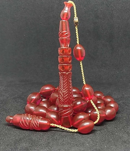 Mücahit Şener imzalı sikkkeli imame ve hitame oyma işçilikli ateş kehribar tesbih. Tesbih çok değerli gerek malzeme olarak gerek işçilik olarak tam koleksiyonluk