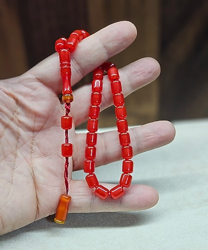 Görselde parlak kırmızı renkte, kare kesim taneciklere sahip bir tesbih bulunmaktadır. Tesbihin ipi kırmızı renktedir. Ürün, günlük kullanım veya koleksiyon amaçlı uygundur.Habbe ölçüsü :7 x 8.5mm dir. tesbih