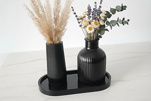 Evinize ışıltı katacak, siyah parlak yüzeyli ve modern çizgili dokuya sahip bu set 3 parçadan oluşur. Set içeriği: 1 adet silindir vazo, 1 adet bombeli vazo ve 1 adet oval sunum tepsisi. Salon, konsol üstü veya ofis dekorasyonu için harika, şık bir parçadır. (Çiçekler görsel amaçlıdır).