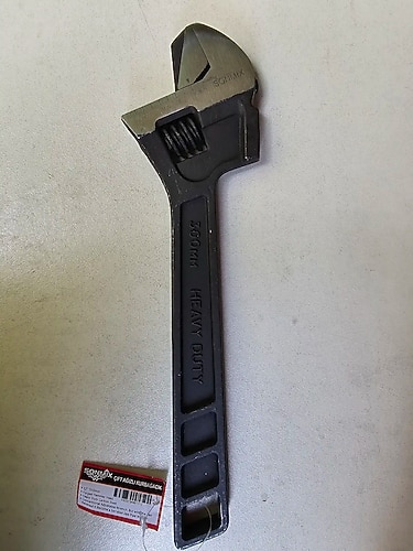Sonmix markasına ait 300 mm (12 inç) boyutunda, dövme karbon çelikten üretilmis çift ağızlı kurbağacık anahtardır.