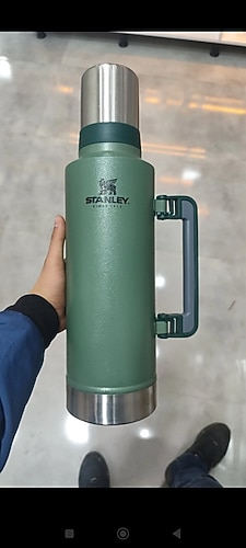 Stanley markalı, haki renkte çocuk termosu. Dayanıklı sapı ve sağlam yapısıyla içecekleri sıcak tutar. Pastel tonu yumuşak bir görünüm sağlar.