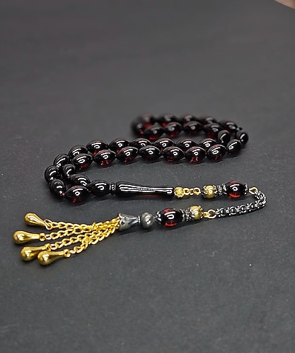 sürmeli toz kehribar özel tasarım püsküllü tesbih habbe ölçüsü 7 x 11 mm dir.