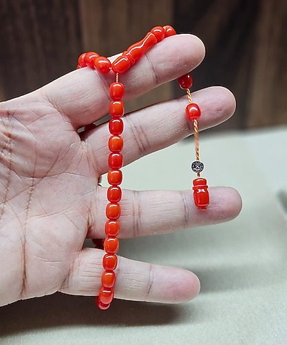 ŞÜKRÜ BABA USTA ESERİ Kırmızı renkli, geleneksel tarzda tasarlanmış erkek tesbih. Parlak cilalı boncukları ve sade minimalist yapısı bulunur. kanayan bağadır.habbe ölçüsü:7×7.5 mm dir.tesbih ölçüsü uçtan tesbih ucuna 25cmdir.