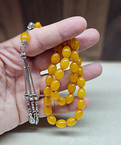 Sıkma Kehribar Arpa Kesim Tesbih Parlak sarı sıkma kehribardan yapılmış, bohem tarzı gümüş püsküllü arpa kesim tesbih. Üzerinde habbe ölçüsü 9×12mm dir. tesbih ölçüsü püskül ucuna kadar 34 cm dir.