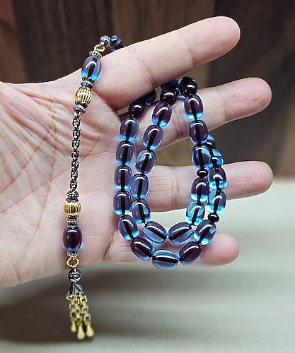ATEŞ KEHRİBARI TESBİH ÖZEL SERİ MAVİ Bohem tarzında, koyu turkuaz renkli boncuklar ve altın detaylı zincir püsküllü erkek tesbih. "ATEŞ KEHRİBA" özel serisi.habbe ölçüsü 11.5×8.5mm dir.tesbih uzunluğu püskül ucuna kadar 40cm dir.