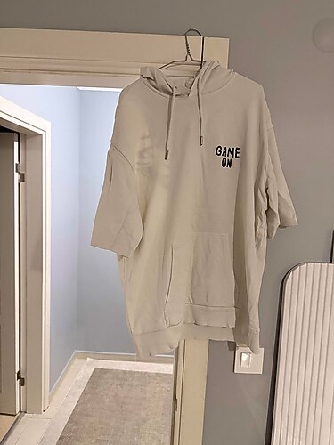 Kısa kol kapüşonlu tişört L beden oversize geniş bir yapıya sahip çok nadir giyildi ama 1 yıldır dolapta kırışmış biraz ütü gerekli