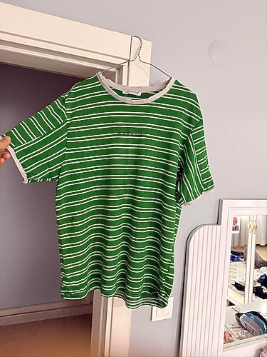 Kısa kollu, yuvarlak yakalı yeşil-beyaz çizgili erkek tişört bir müddet giyildi bedeni küçük geliyor kilo aldım xxl ama L giyen biri alsın daha iyi