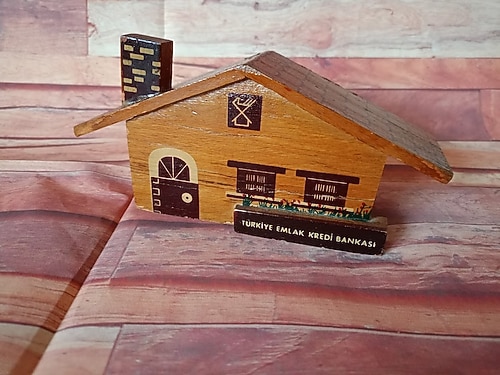 1970 li dönemlerde Emlak Kredi Bankası tarafından çıkartılmış, ahşap malzemeden üretilmiş ev formunda kumbaradır.