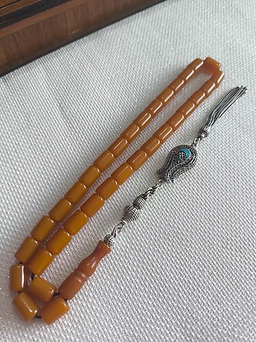 Şükrü Şimşek usta işçilikli Firuze taş işlemeli Ayyıldız Motifli 925 Ayar Gümüş Püsküllü çekimiyle renk alır Çubuk Sıkma Kehribar Tesbih