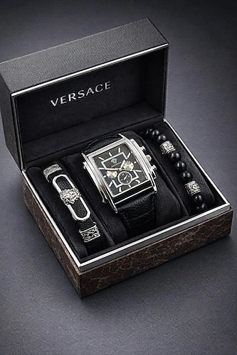 Versace Set Siyah Kadran Gümüş Kasa Erkek Saat + Bileklik + Kolye