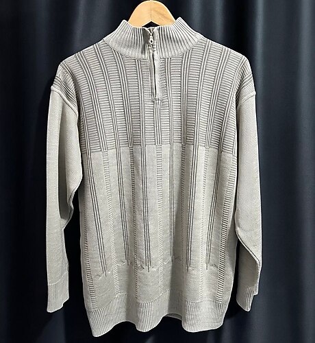 Vintage İnci! Bej tonlarda dikey desenli, yarım fermuarlı yaka detaylı kalın triko kazak.