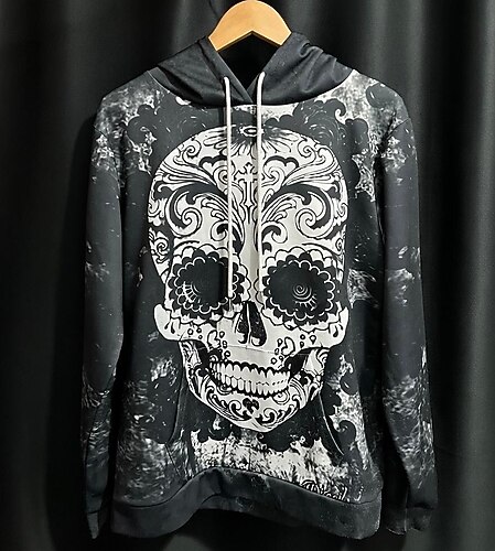 Y2K Gothic Treasure. Vintage siyah hoodie, dev ornate skull print’le (Dia de los Muertos esintili).