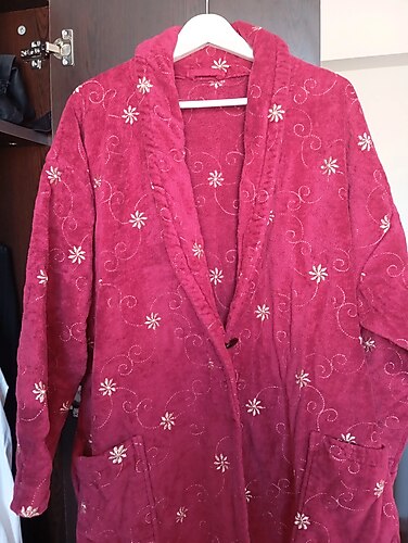 Ürün çeyiz için alındı ama deneme dışında kullanmadı. Parlak pembe renkte, uzun kollu, nakışlı desenlere sahip bol kesim kadın bornozu. Midi boy ve ön ceplidir oldukça kalın ağır çok kaliteli bir yeri var. Yüzde yüz pamuk. İki koltuk arası 68 cm, basen 73 cm, kol boyu 60 cm, boyu 118 cm'dir. 44 beden ile 52 beden arası tercih edebilir. Özellikle hamile olanlar için de çok uygun.