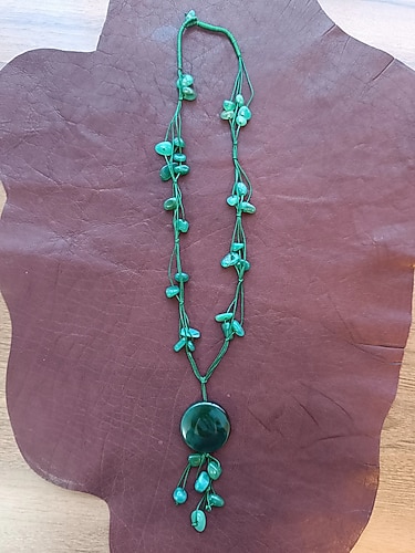 Yeşil akik taşlar kullanılarak yapılmış harika kolye. Kolye taşları orijinal doğal taş olup güzel bir parlaklık ve görünüme sahiptir. El yapımı yeşil akik taş kolye. Büyük yuvarlak taşın ortasında fotoğraflarda görünen küçük çizik vardır.