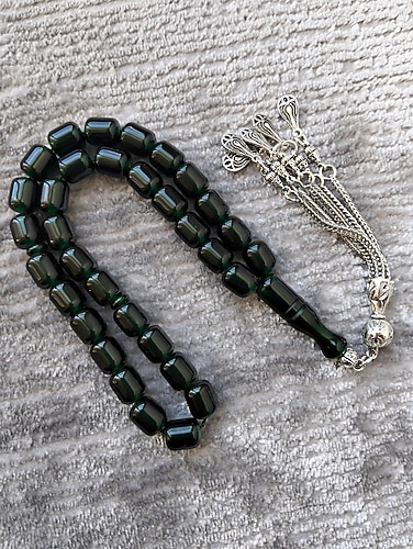 Koyu yeşil tonlarda, cennet yeşili koyulukta duruş olarak kallavi bir tonda, el boy olup gündelik çekim için ideal orjinal Sıkma Kehribar,10*8 mm ölçülerinde,kararma yapmaz gümüş kaplama püskül ile hatasız bir eser, alanın elinden bırakmayacagi şıkır şıkır ürün.