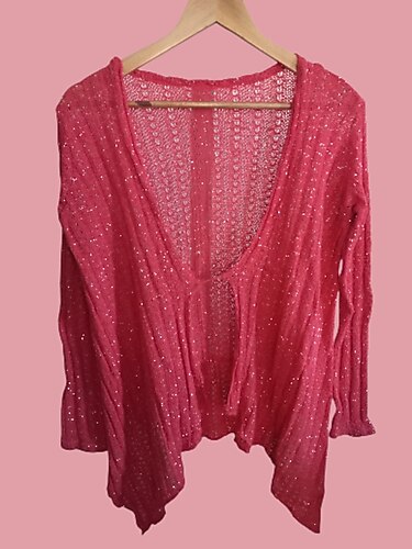 Zeyy Marka Bayan Simli Örgü Hırka: Lekesi&söküğü yoktur. İki yanları uzun ortaları kısa tarz bir modeldir. Simlidir. Sol üst ön kısım sökülmüş dikilmiş simden belli olmuyor. Rengi koyu somon rengi gibidir. Ön alt ve bağlama yeri düğüm atılmış üstten giyilebilir yada düğüm çözülebilir. İç etiketinde Viskon ve Polyester olduğu yazıyor ancak % oranı yazmıyor. Beden yazmıyor. L bedene olur gibi duruyor. Ancak iade olmadığından verdiğim ölçülere göre alım yapınız. Yandan boy 81 cm., ön orta boy 59 cm.-Koltuk altından itibaren boyu 39 cm.-Koltuk altından koltuk altına tek taraftan eni 50 cm. (Esneme 24 cm.)-Orta kısımdan tek taraftan eni 55 cm. (Esneme 30 cm.)-En altından tek taraftan eni 91 cm.-Omuz 10 cm.-Kol boyu 56 cm.-Kolun orta kısmından tek taraftan eni 9 cm. (Esneme 9 cm.)-Bilek girişinin tek taraftan eni 10 cm. (Esneme 3 cm.)-Kol oyuntusu 18 cm. (Esneme 6 cm.)-Ense 21 cm. (Esneme 7 cm.)'dir. #hırka #kadın hırkası #bayan hırkası#simli kadın hırkası #simli bayan hırkası